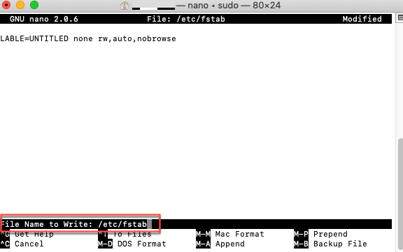 This will open the fstab files using the nano text editor. You will need to enter the administrator password.