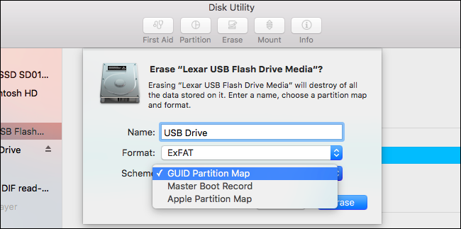 Step 5: Give the drive a name, choose MS-DOS (FAT) or exFAT in the context menu, and then choose a scheme.