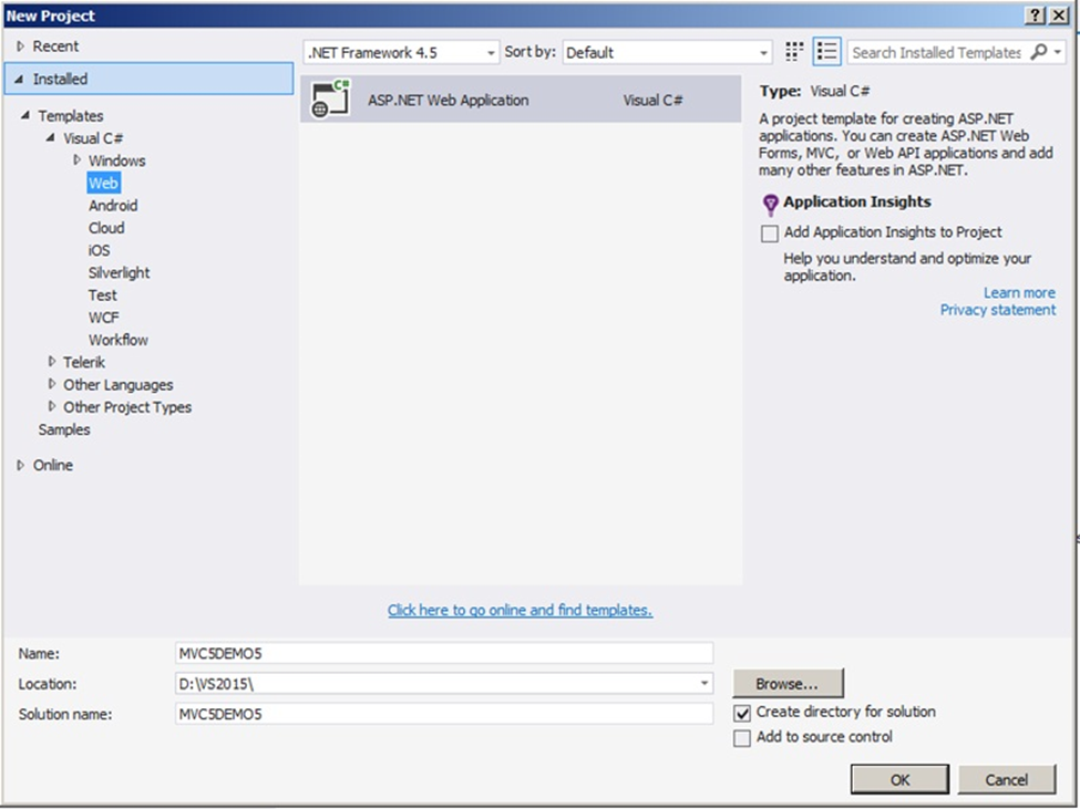 After selecting New Project, we will select Web Templates from the left side of the panel after the selection of Web Template, we will see only one project template in that portion which is “ASP.NET Web Application”, select that.