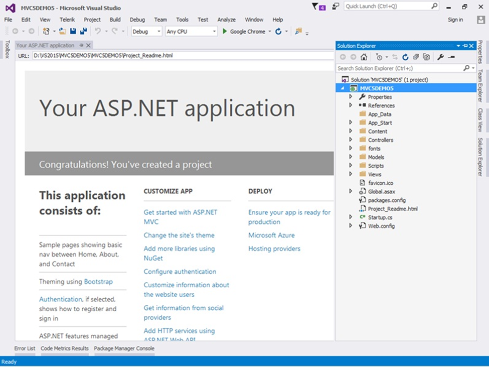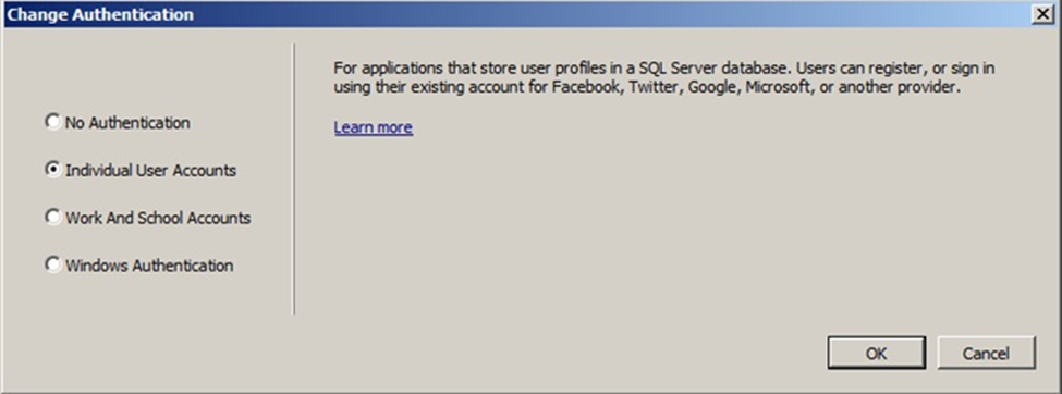 When we choose this option for Authentication of application, it will be configured to use ASP.NET Identity where the User can register in the Application and sign in using the credentials. New features of MVC 5 also support Sign in via Facebook, Google, Microsoft, and Twitter. All the data are collected and stored in the SQL Server database.