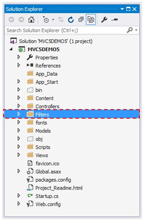 Now, we will add the Filter folder to the Project. For that, right-click on MVC5DEMO5 and select Add, and inside that select New Folder.