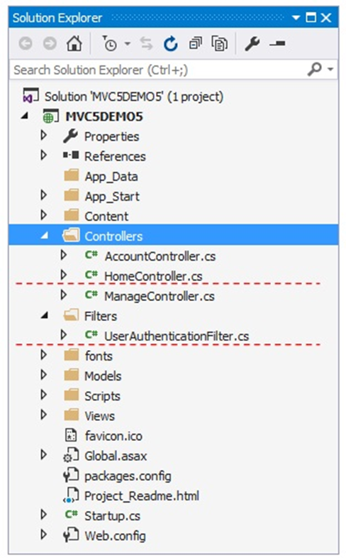 Next, we will apply the UserAuthenticationFilter Filter on HomeController. This controller is created by default when we have created a project.