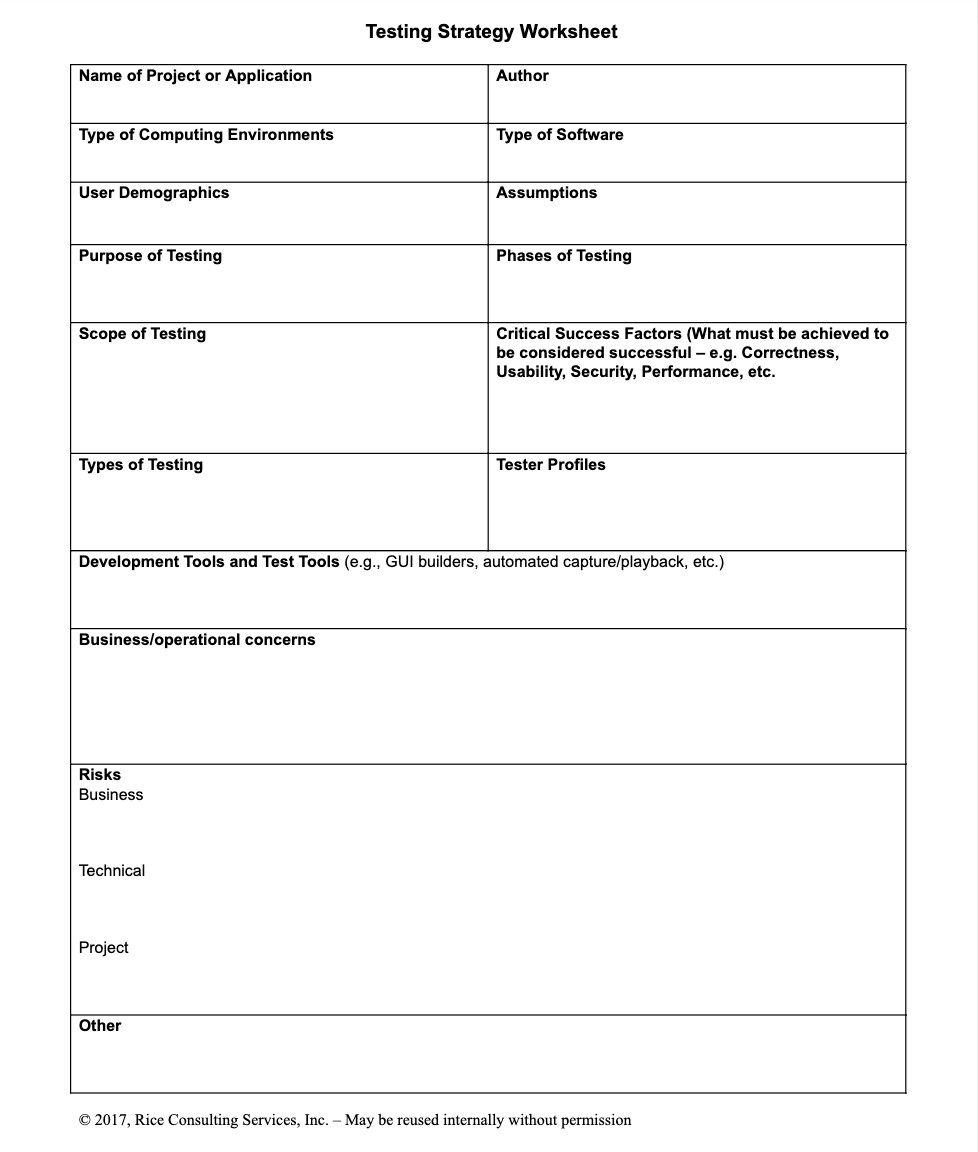 A Test Strategy Worksheet is a document that outlines the exact approach to software testing that the business plans to take. A well-constructed test strategy worksheet plays a massive role in the success of the assessment process.