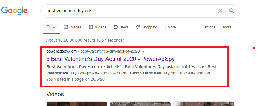 In fact, most of the successful SaaS industries utilize content marketing strategies to nurture sales growth in their business. Here is an example in which you can see the search results showing PowerAdSpy ads-intelligence software for the keyword- best valentine day ads.