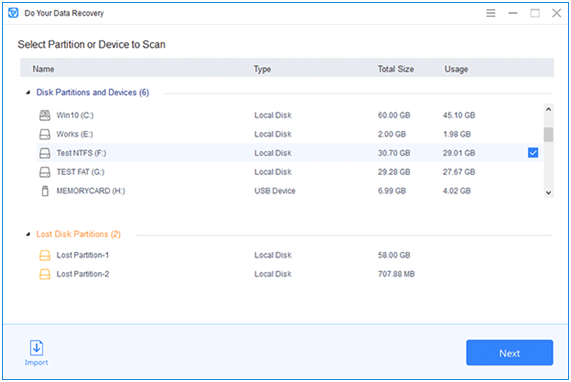 Do Your Data Recovery Free also supports to recover deleted or lost files from external storage device including memory card, digital camera, digital camcorder, SD card, digital voice recorder, MP3/MP4 player, portable hard disk drive, etc. You just need to connect the external storage device with your computer, then run this data recovery freeware to scan the device. It will find the deleted files on the external storage device.