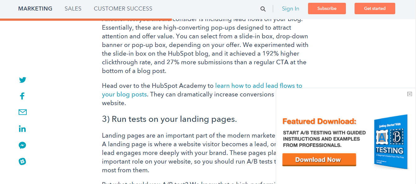 Include lead flows on your blog ie CTAs that will interest users. These are high-converting pop-ups designed to attract attention and offer value. You can select from a slide-in box, drop-down banner or pop-up box, depending on your offer. HubSpot experimented with slide-in box on their blog and it achieved a 192% higher clickthrough rate than a regular CTA at the bottom of a blog post.