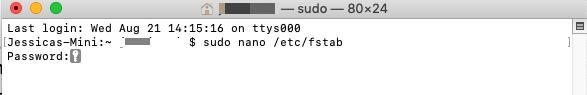 This will open the fstab files using the nano text editor. You will need to enter the administrator password.