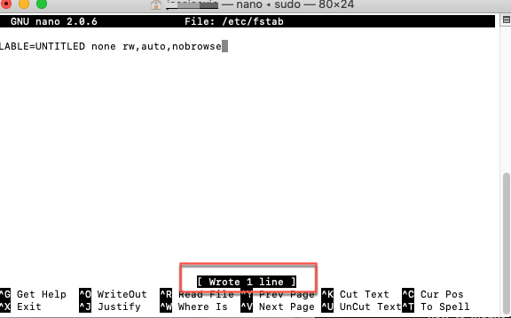 Remember to replace the DRIVE_NAME with your NTFS drive name. Press CTRL + O to save changes and CTRL + X to exit.