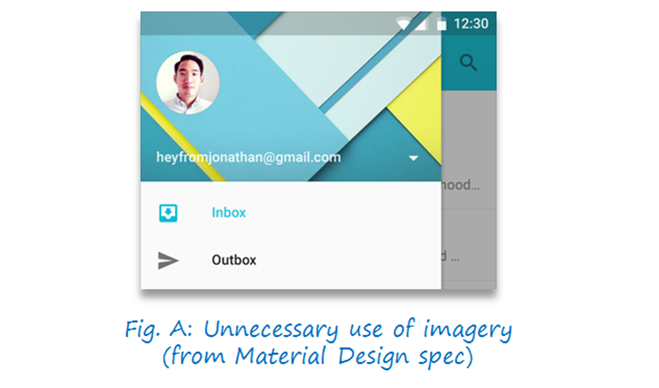 For example, the following menu appears several times in the Material Design documents. It uses an unnecessarily high-contrast header background with multiple layers and off-grid lines which may be fun to look at once, but is functionally crappy because it makes the text hard to read and can get annoying when the menu is opened multiple times: