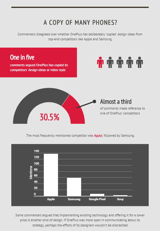 One in five comments on OnePlus’ design-related videos referenced at least one of the company’s competitors, and most often these weren’t in OnePlus’ favor.